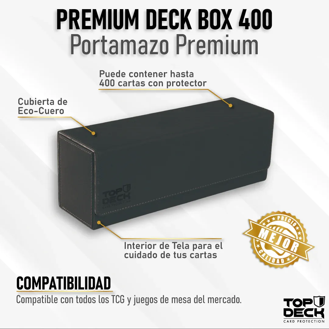 Protege y organiza tus cartas con este práctico Portamazos Premium para Cartas, perfecto para los coleccionistas y jugadores más exigentes. Con capacidad para hasta 400 cartas con Protectores, este Portamazo Premium garantiza que tu baraja esté segura y bien cuidada. Fabricado con una cubierta de eco-cuero y un interior de tela, tus cartas estarán más protegidas que nunca y tu baraja se vera realmente elegante.